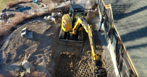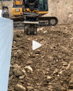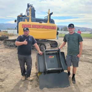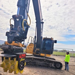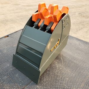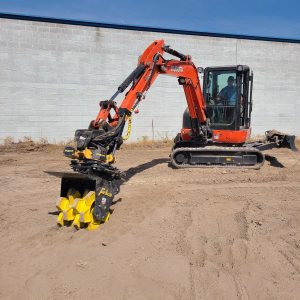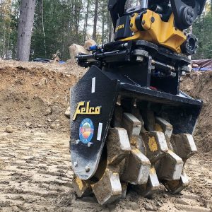 Felco 20″ wide Mini Ex Roller Compaction Bucket built to mount on a Bobcat E50 Compact Excavator with a Kinshofer cylinderless NOX Tiltrotator.