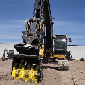 Felco 24” wide Tamping Pad Wheel Compactor on a John Deere 135G Excavator with a SteelWrist Tiltrotator Coupler